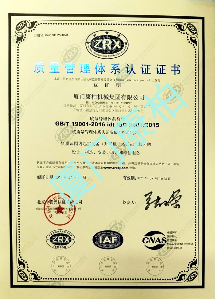 質(zhì)量管理體系認(rèn)證證書(中文)